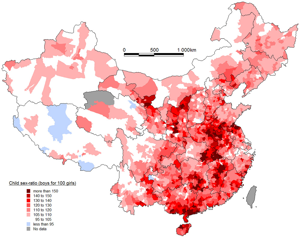 I came across this article on sex-selective abortion on The Rational Optimist (via Jad Abumrad‘s tweet), about the skewing of sex-ratios as access to wealth, abortions, and ultrasound technology increases. This, for example, is a map of China showing sex ratios by region. White areas have naturally-occurring ratios. The darker the red, the higher the skew towards males (and the richer the region). This kind of thing is happening in about half of the world’s countries, not just China, and it’s likely to increase as we get better at sperm-sorting and genetic manipulation.